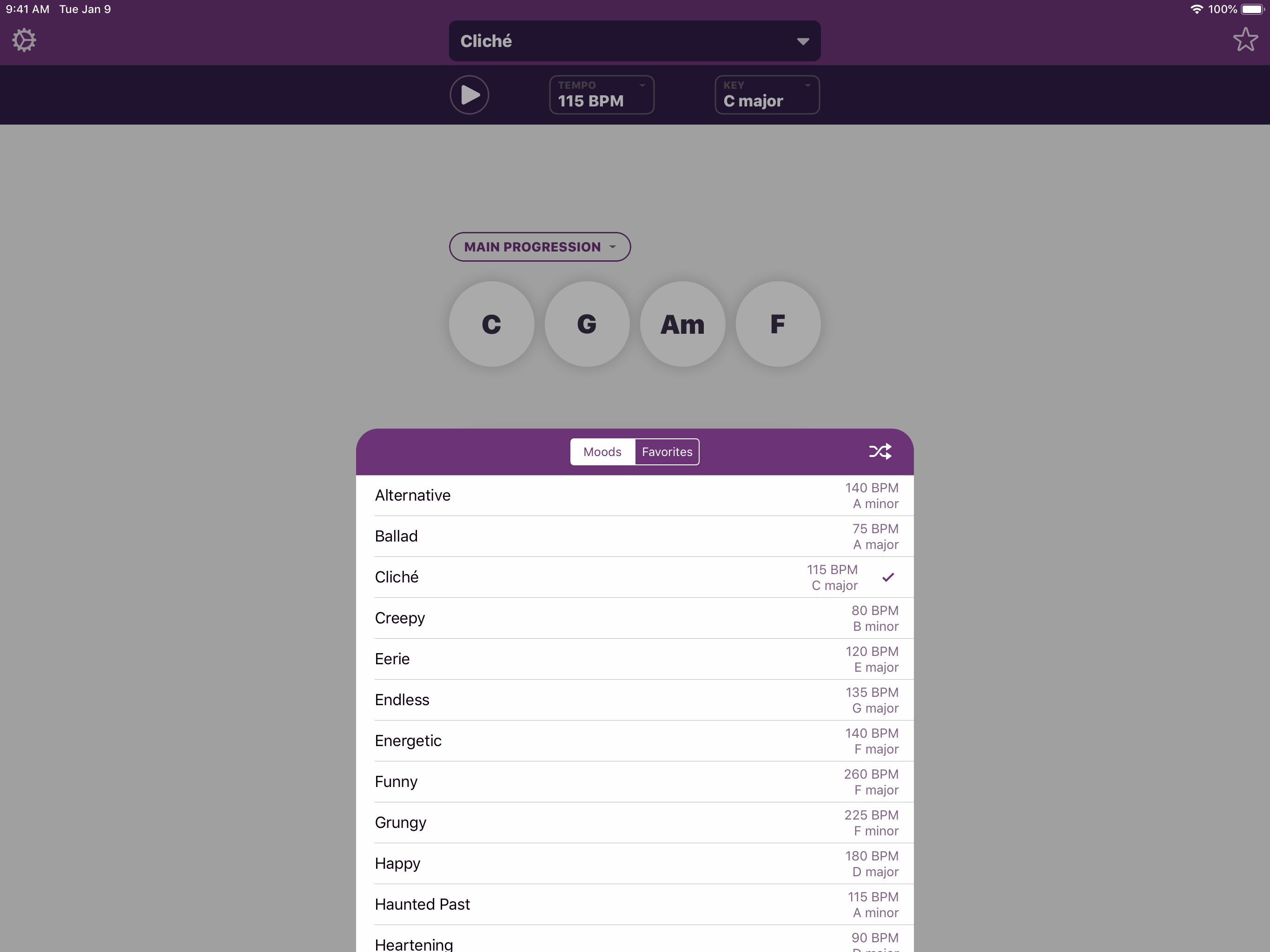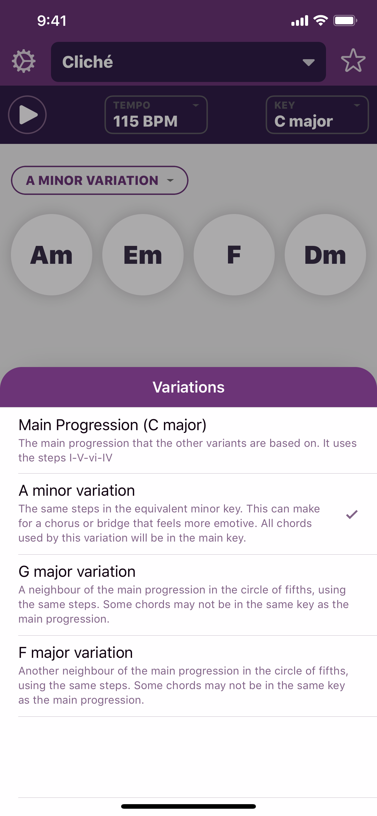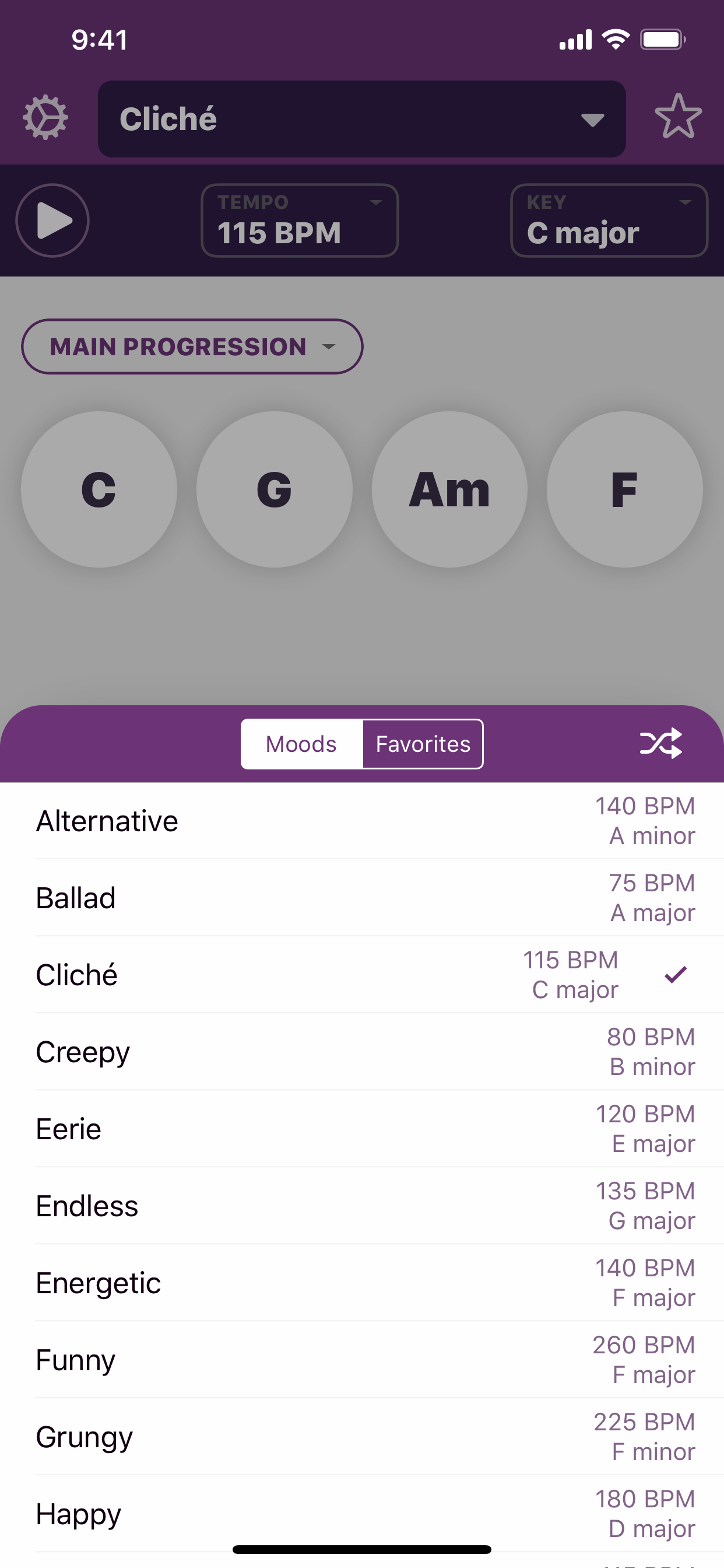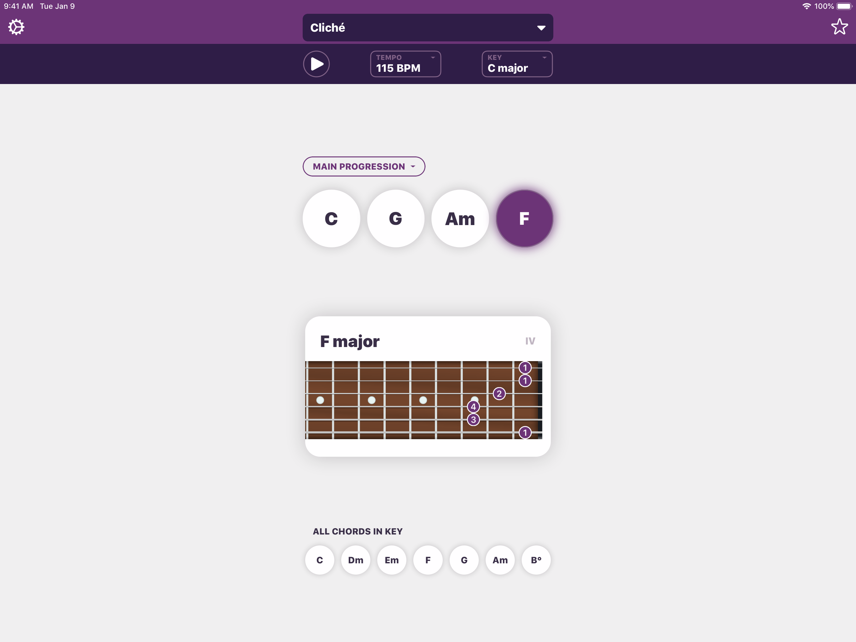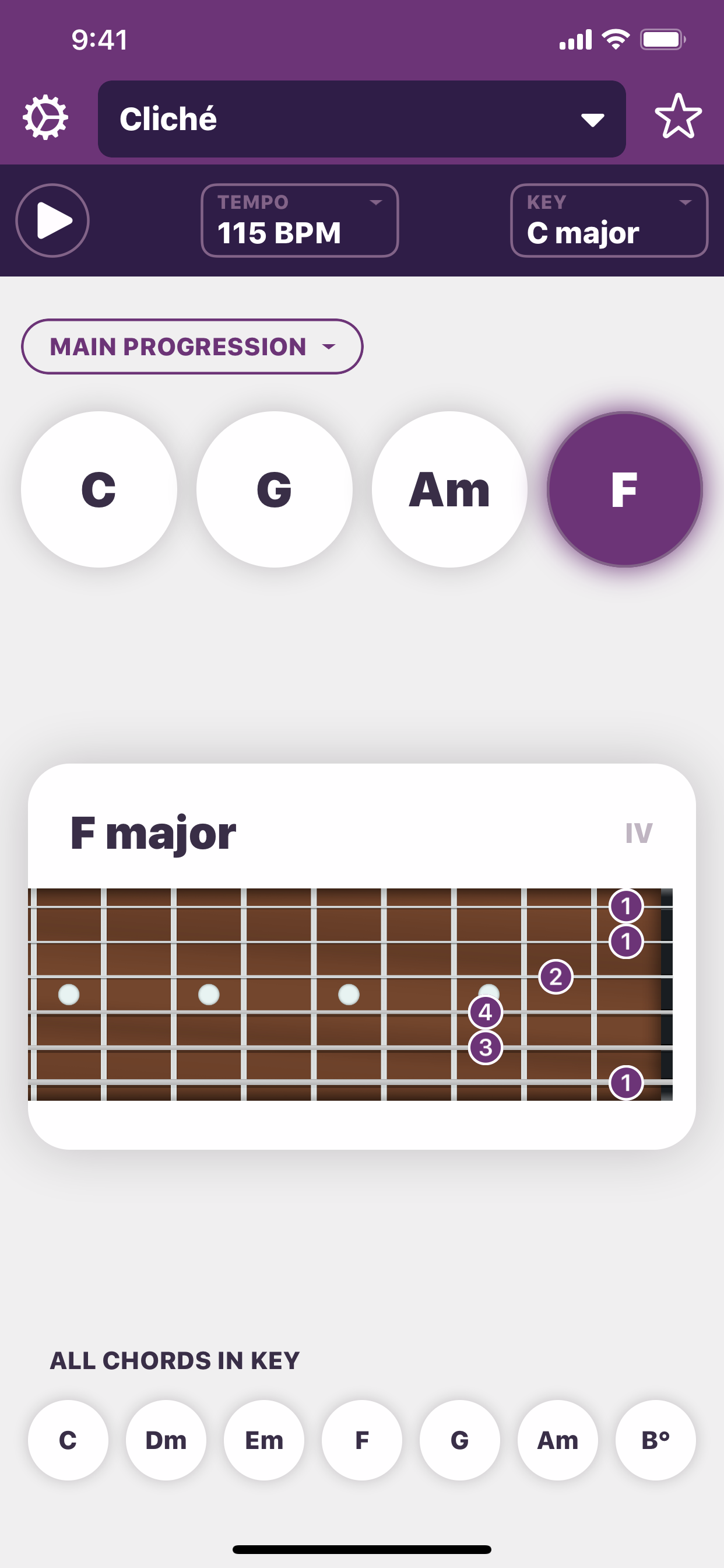 Just pick a progression style and a key that you're comfortable playing in, and Autochords will show you what to play for your Main Progression. You can preview the entire progression in the selected tempo with the tap of a button.