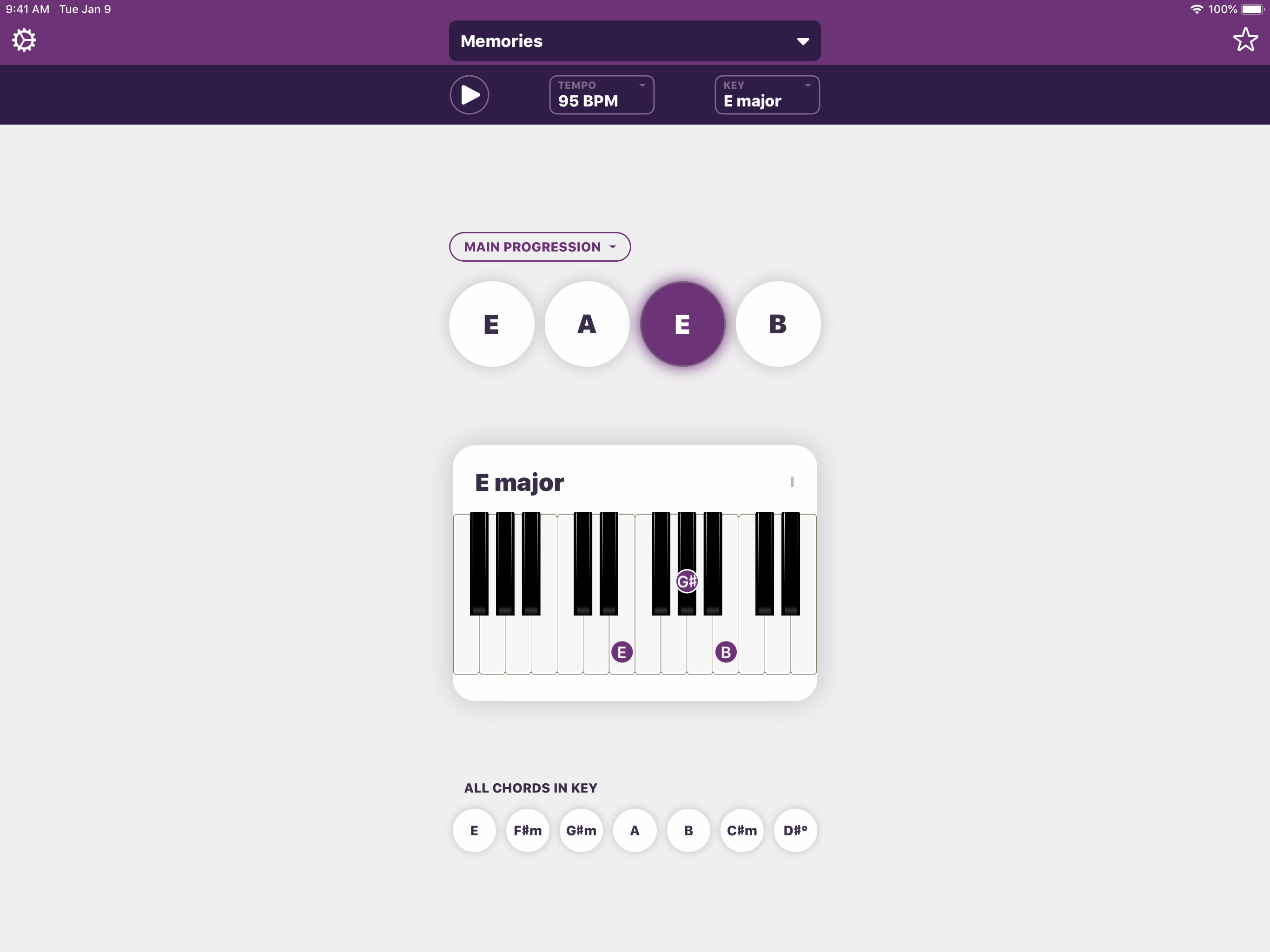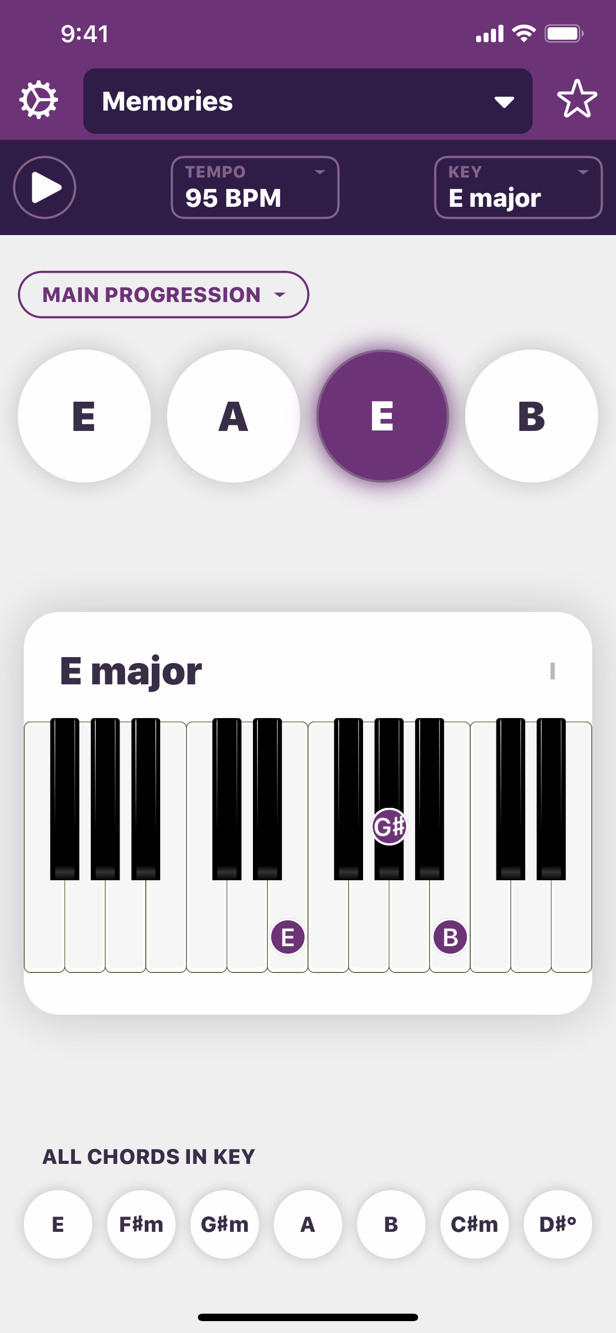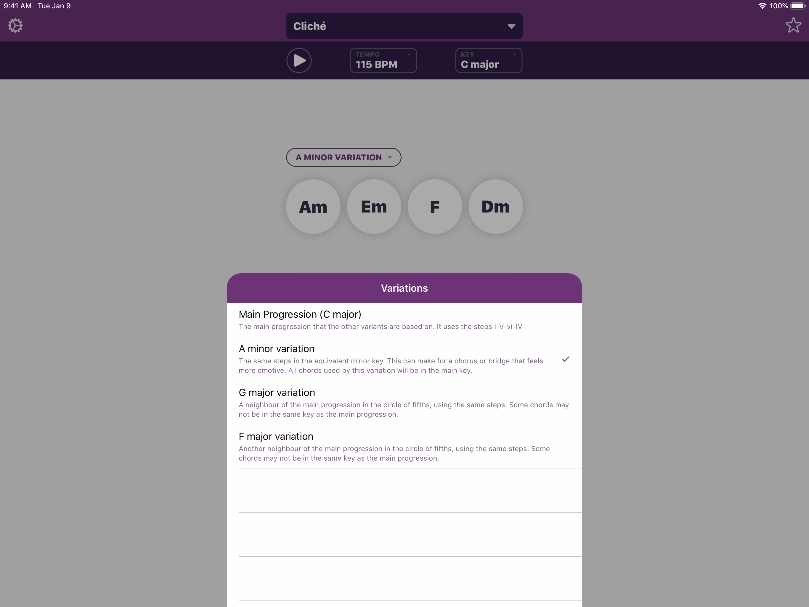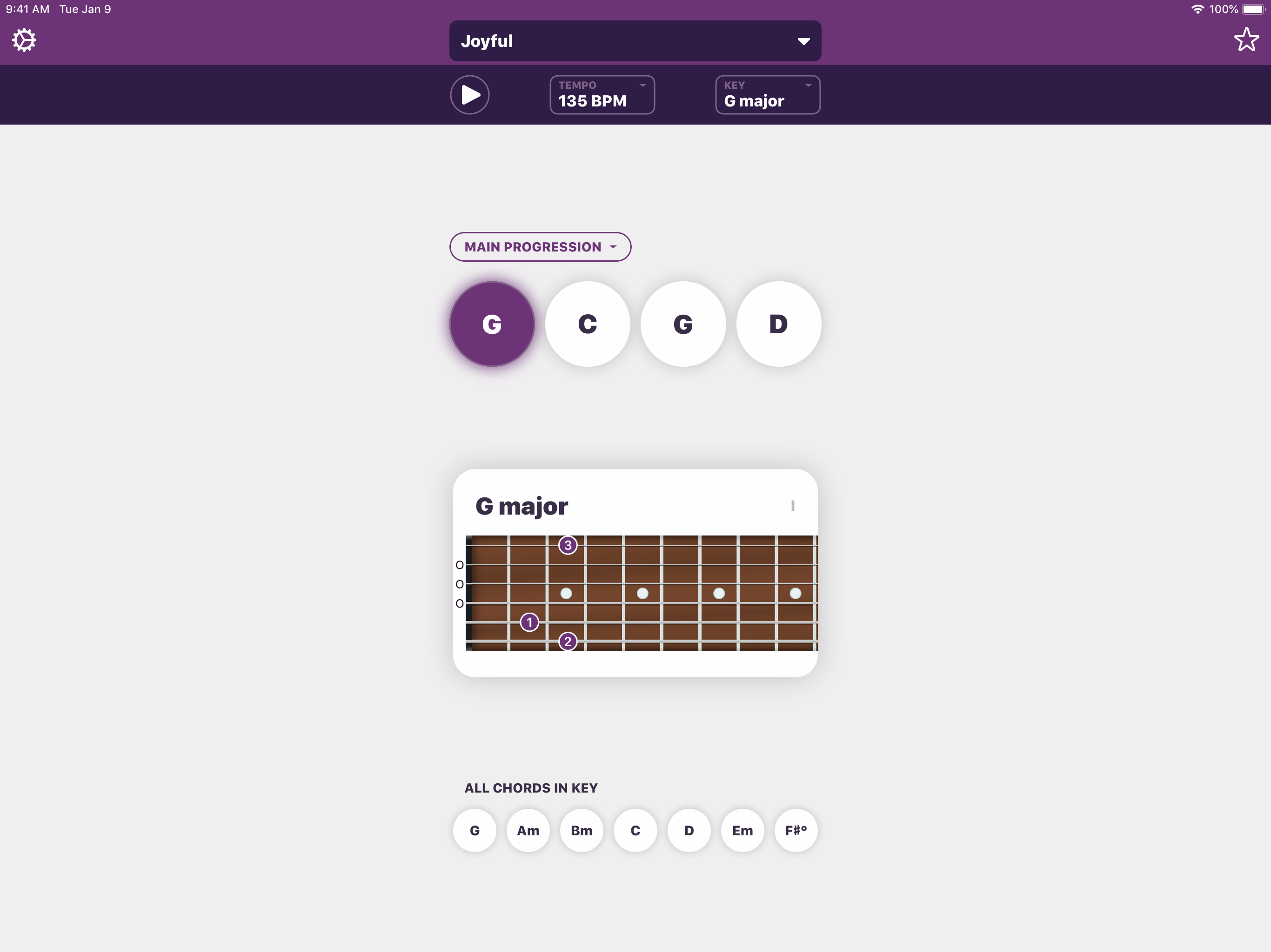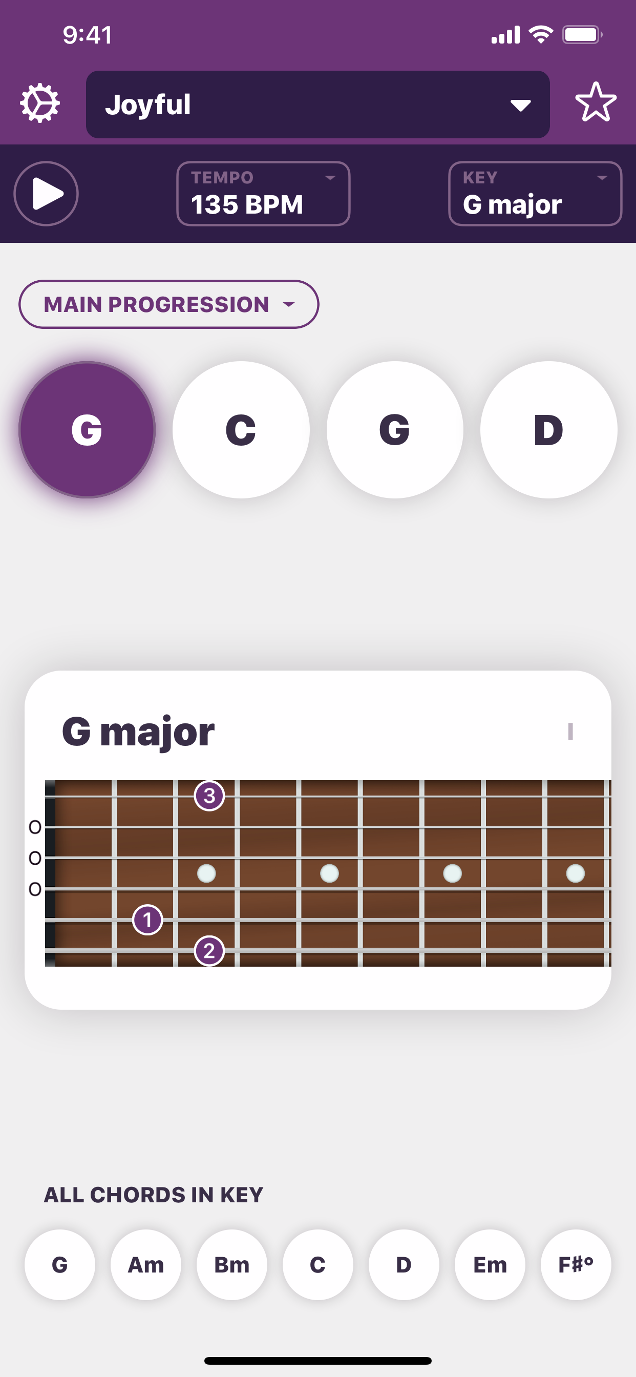 Just pick a progression style and a key that you're comfortable playing in, and Autochords will show you what to play for your Main Progression. You can preview the entire progression in the selected tempo with the tap of a button.